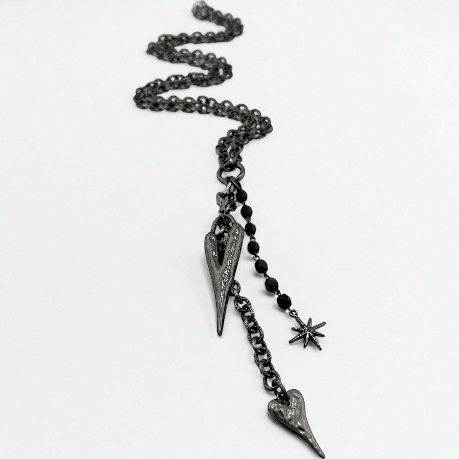 Now available in two fierce lengths — the original 18" or a bold 28" that you can wear long or double wrap thanks to the magnetic clasp. The Vixen Heart Drop Necklace isn’t playing nice. Designed with an antique gunmetal chain, this piece drips with edge and confidence. The elongated, hammered heart pendant brings serious attitude, flanked by black faceted beads, a gleaming starburst, and a sculpted mini heart.