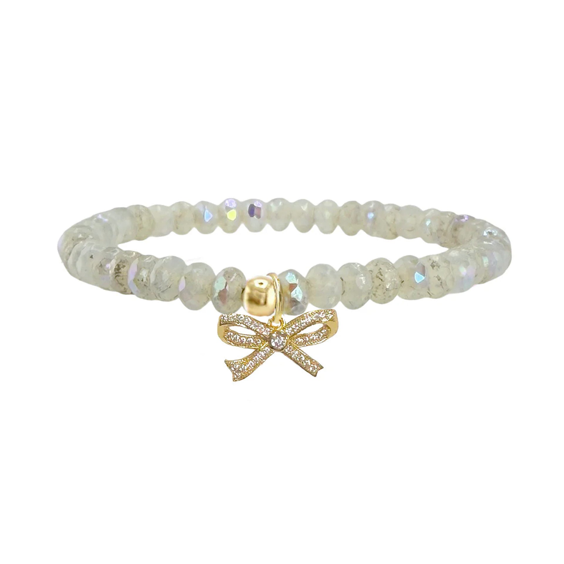 Add a playful touch of sparkle to your wrist with the Harper Pretty CZ Bow Bracelet. Crafted with 5mm faceted Harper crystal beads, this stretch bracelet shimmers beautifully in every light. The CZ bow charm brings a hint of femininity and fun to any look, making it the perfect mix of elegance and charm.