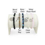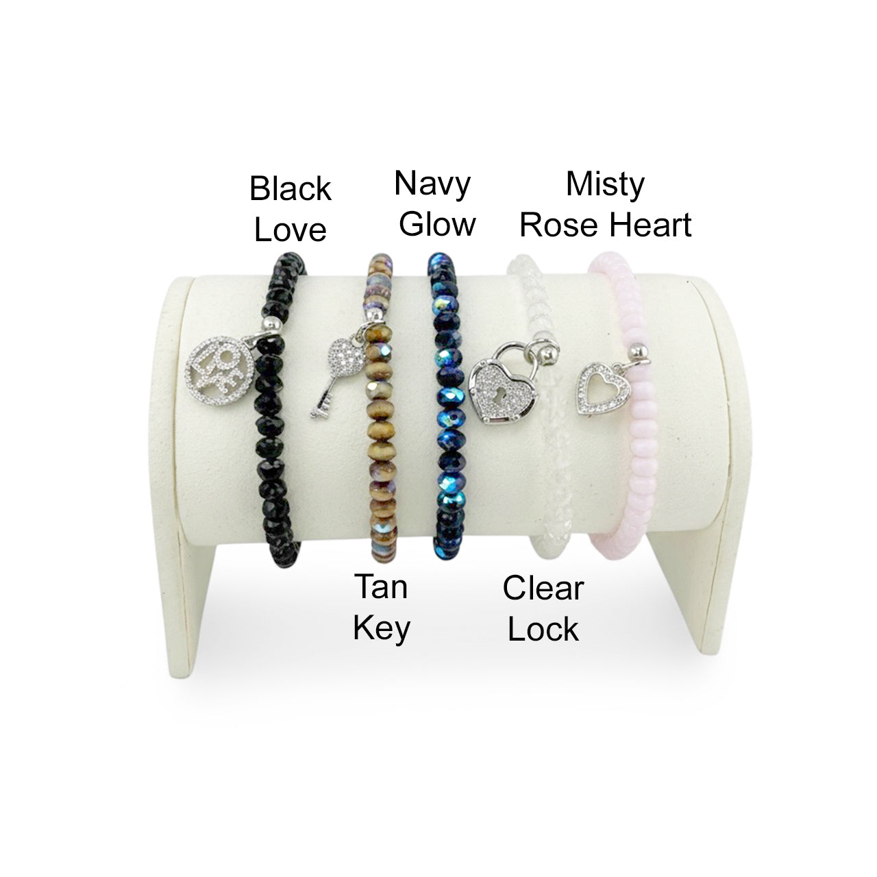 The Harper Unlock My Heart Crystal Bracelet Stack features five coordinated stretch bracelets designed to tell a love story through layered sparkle and meaningful charm details. This crystal stretch bracelet set features faceted beads in soft blush, deep blue, champagne, navy and black, finished with polished silver heart lock, key, open heart, and LOVE charms accented with clear crystals.
