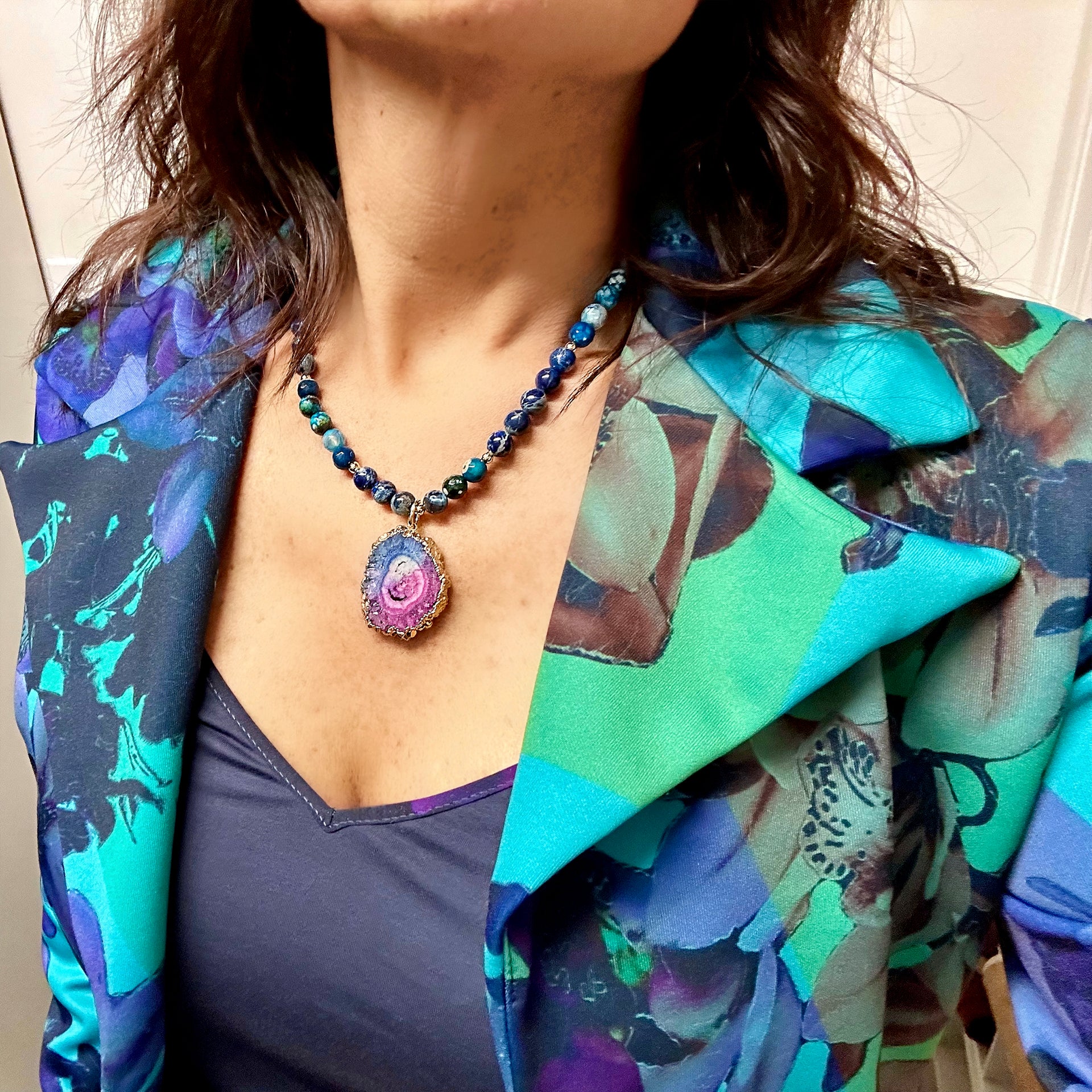 Introducing the exquisite Deborah Druzy Necklace, featuring a one-of-a-kind natural gemstone that perfectly embodies this season's Pantone colors. This "Baritone Blue" necklace combination is super unique. This 16" necklace is truly unique, so don't miss out on this gem! Please note that each druzy stone is slightly different due to the natural nature of the stones.