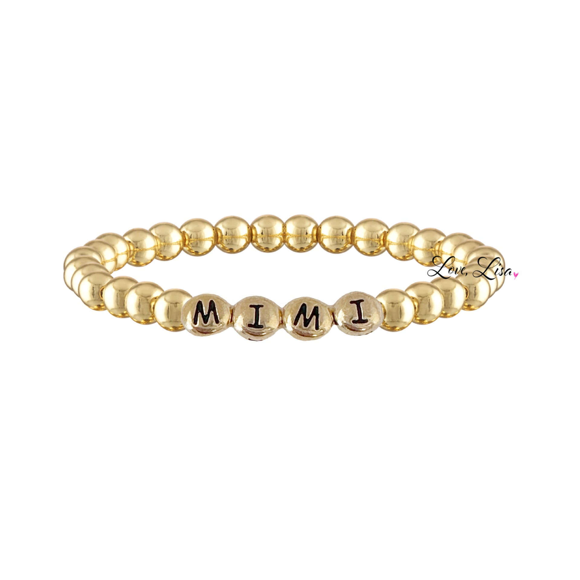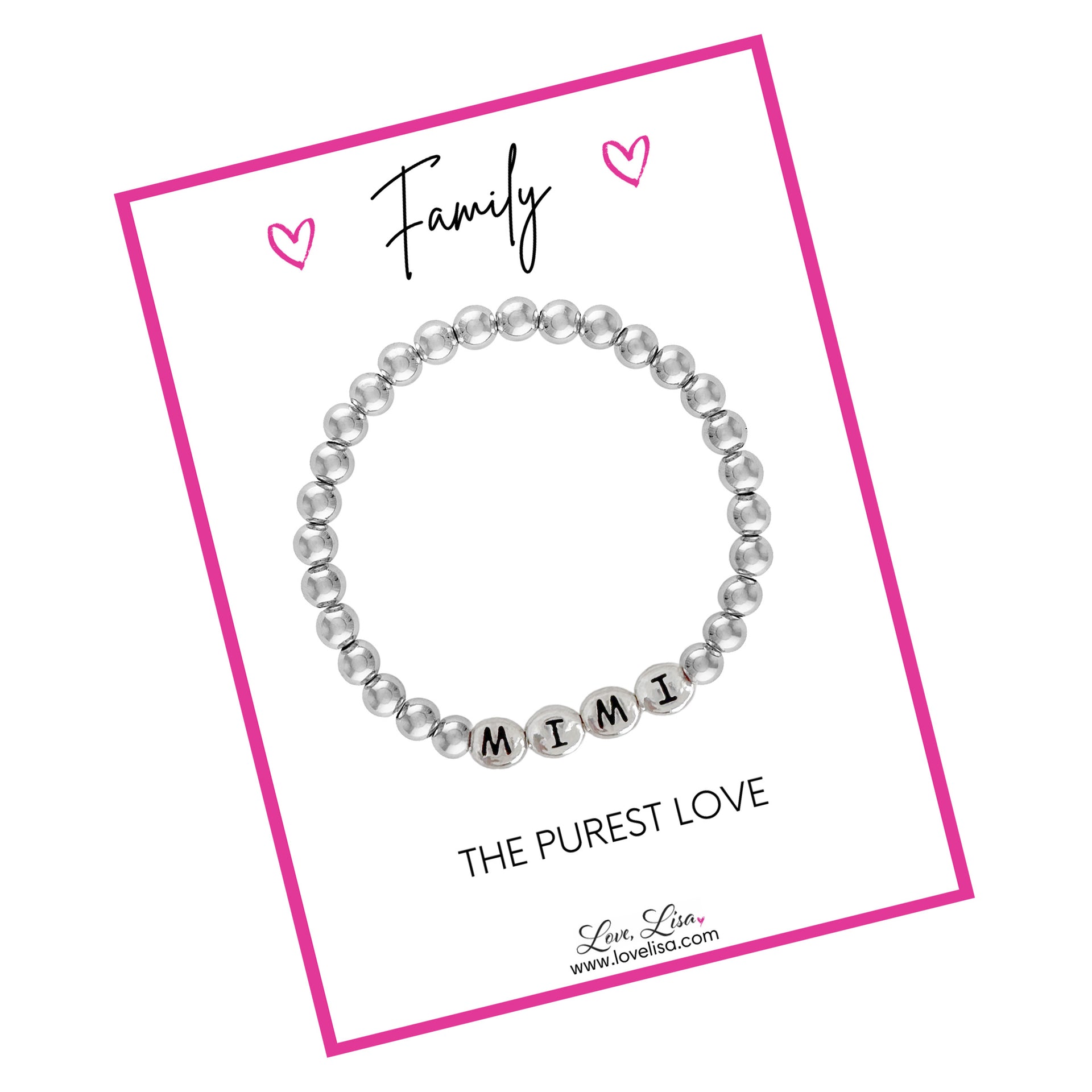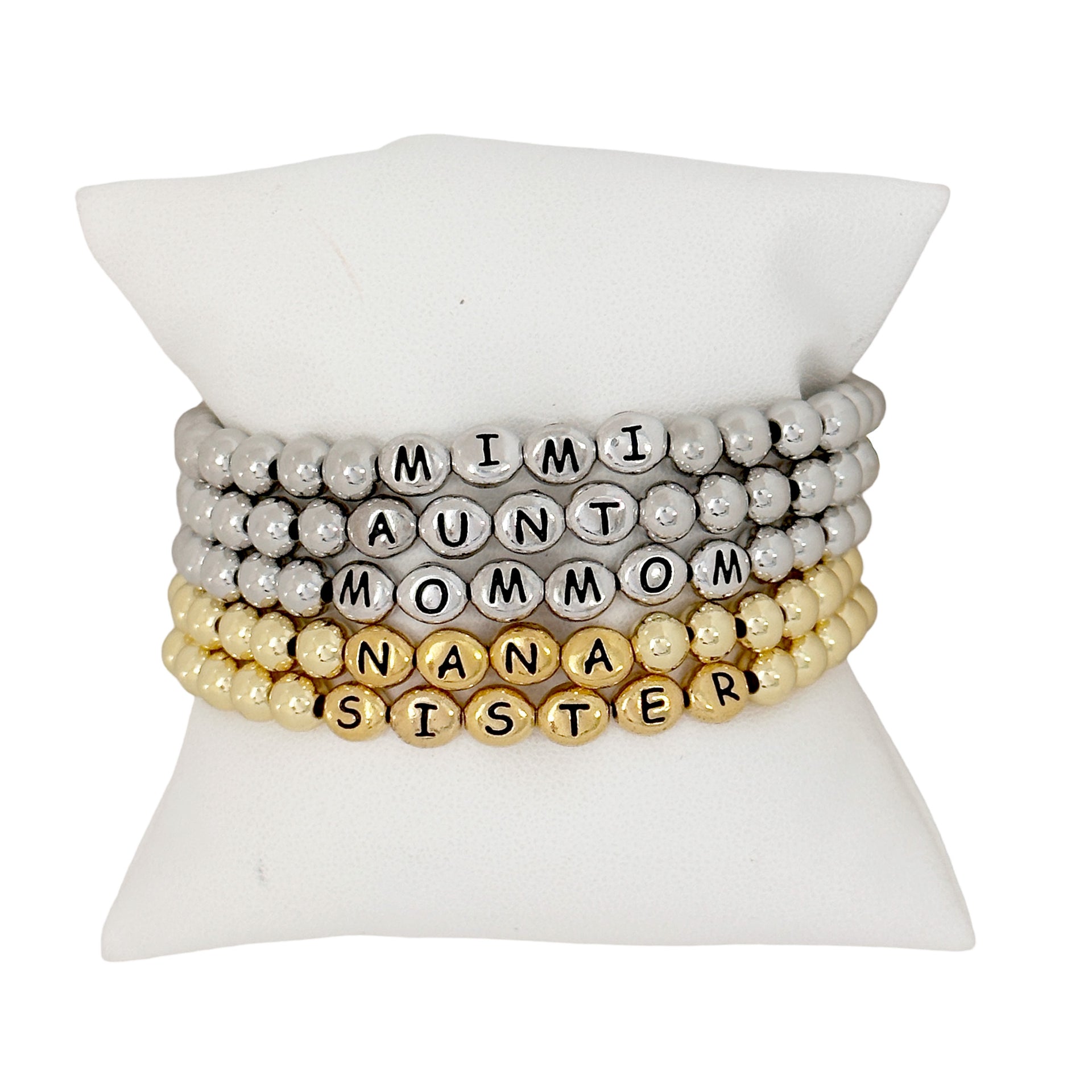 Celebrate family with the Carrie Family Bracelet — a sweet, meaningful reminder of love and connection. Each bracelet features 6mm gold or silver beads and letter beads that spell out your special family role — Mimi, Mom-Mom, Aunt, Sister, or Nana.