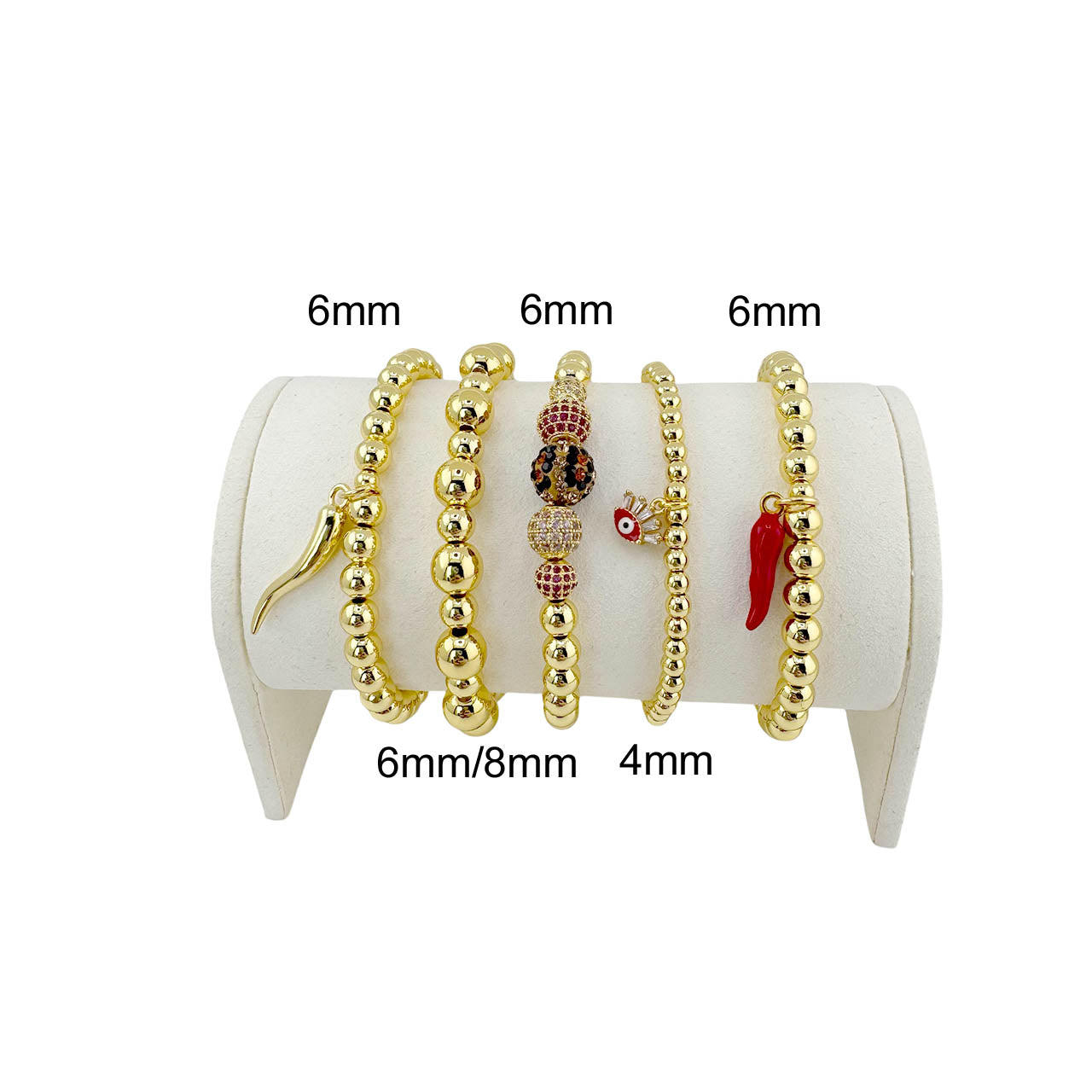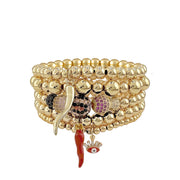 The five bracelet Italian horn stack features a mix of 4mm, 6mm & 6mm/8mm beaded bracelets. Each bracelet measures 6.85" and is made with elastic.