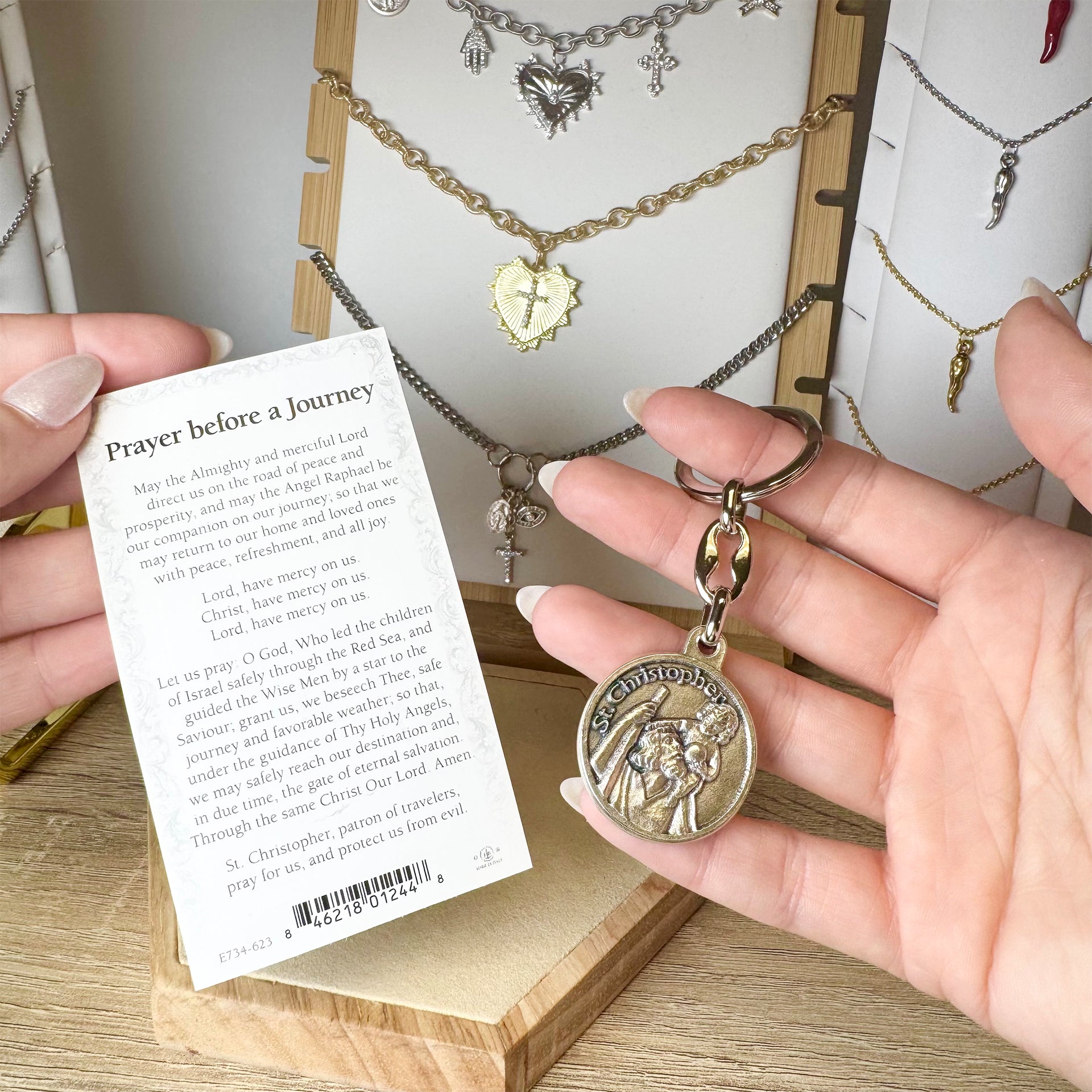 Carry the blessing of Saint Christopher on your journeys with this keychain. As the patron saint of travelers and motorists, his image brings luck to your travels. Legend has it that he carried a child across a river, symbolizing safe travels. An amazing gift for yourself or loved ones. This adorable keychain comes with the prayer card.