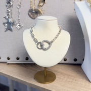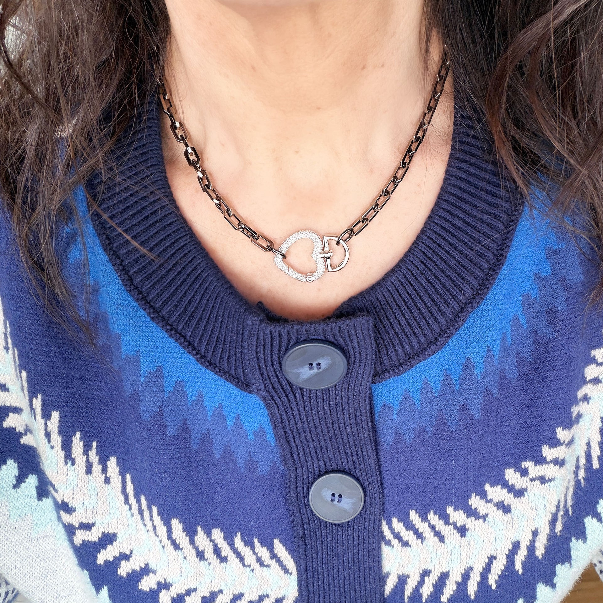 A lobster clasp in the back makes it easy to take on and off, so it wears beautifully without fuss.  Available in gold, gold with a silver heart clasp, silver, or gunmetal, this necklace works just as well worn solo as it does layered with your go to pieces. It is timeless, confident, and designed to be styled your way.