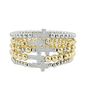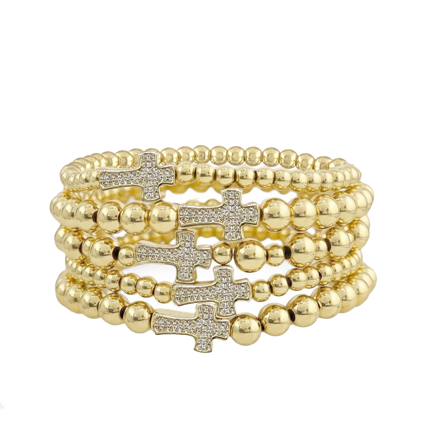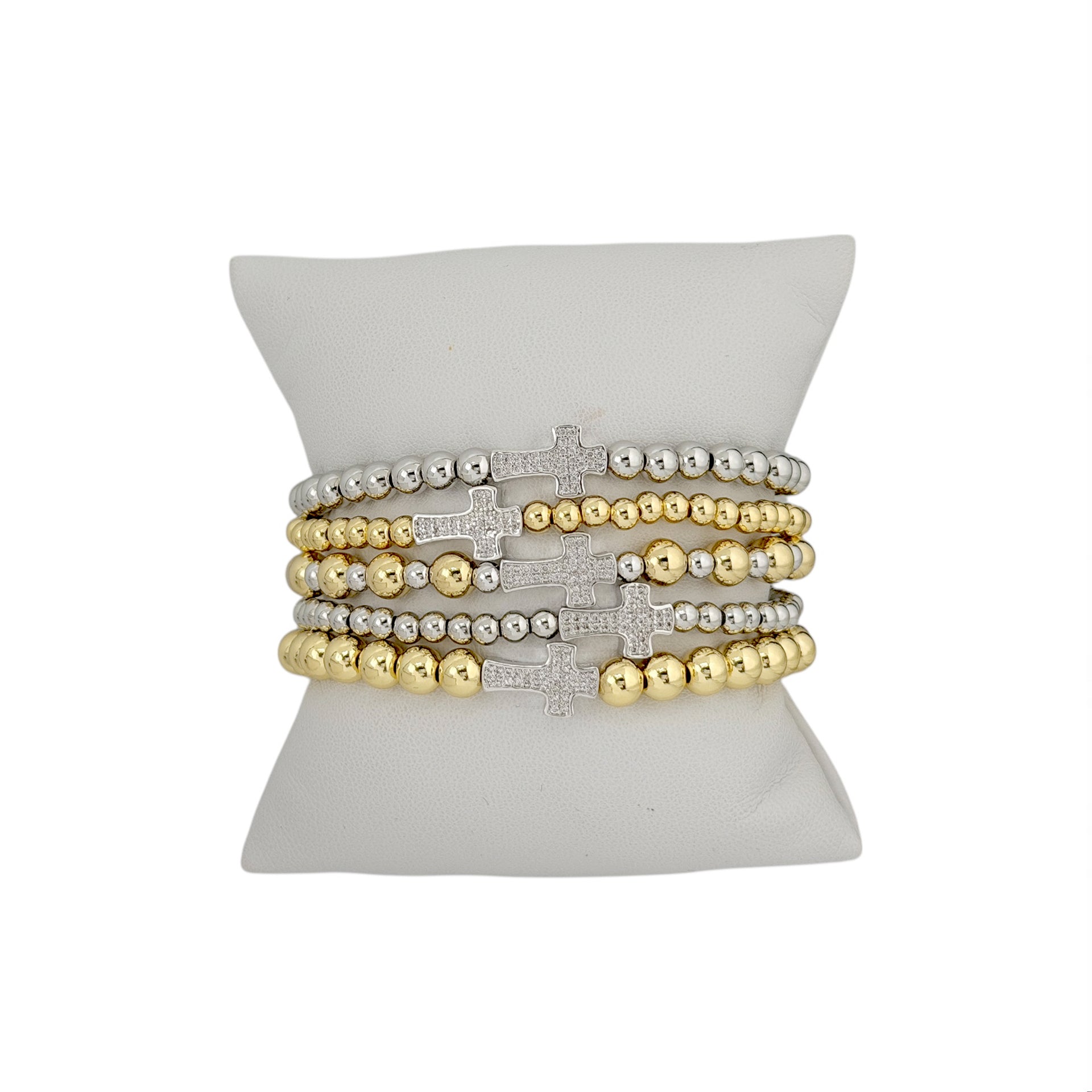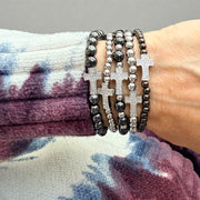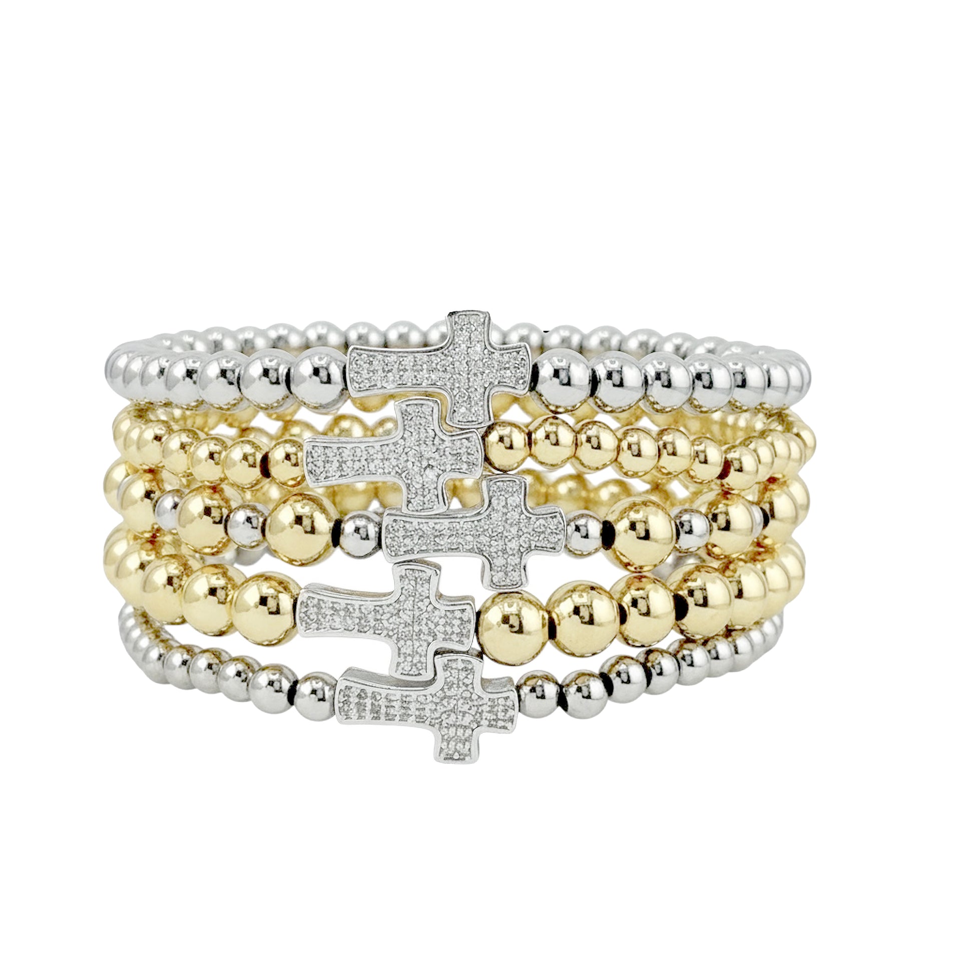 The Christine Cross Bracelet Stack brings a polished sparkle to your everyday stack with smooth metallic beads and a pavé covered cross charm that catches the light beautifully. Designed on a comfortable stretch fit, each bracelet layers effortlessly with your existing favorites while adding a meaningful touch you can wear from morning to night. Available in gold silver silver gold mix and gunmetal silver mix this versatile set lets you choose the finish that fits your style. Wear one for a subtle shine or stack multiples for a bold statement.