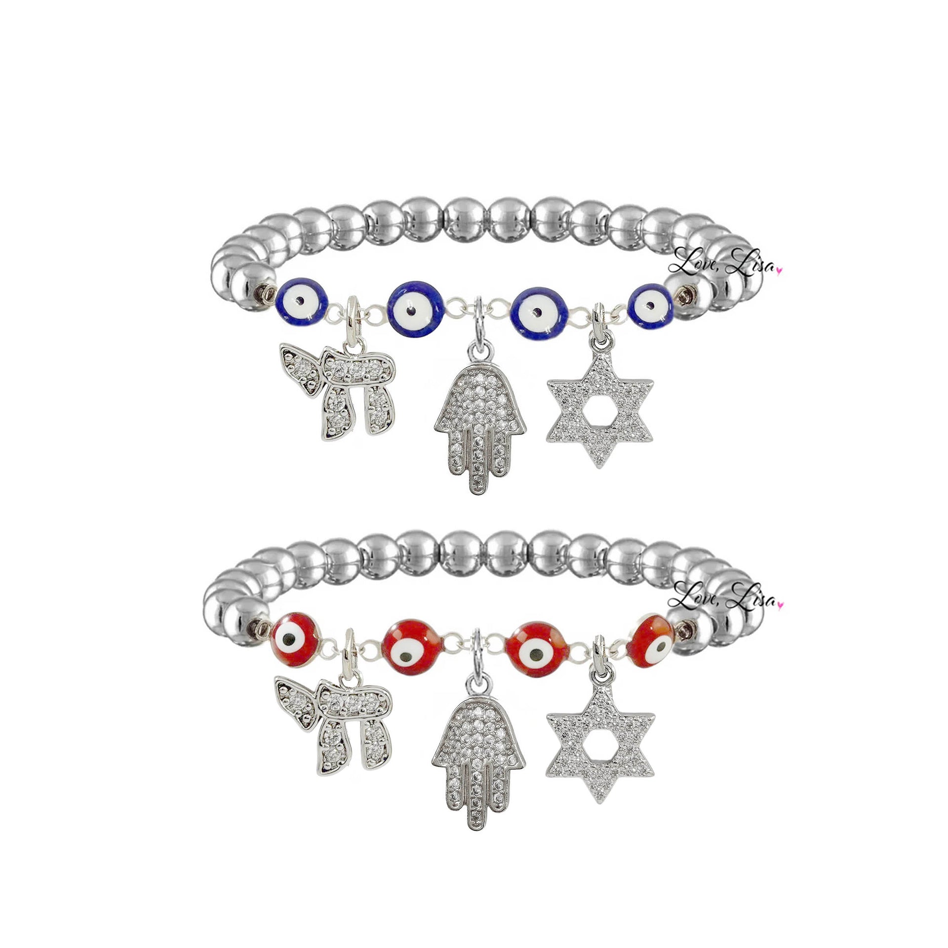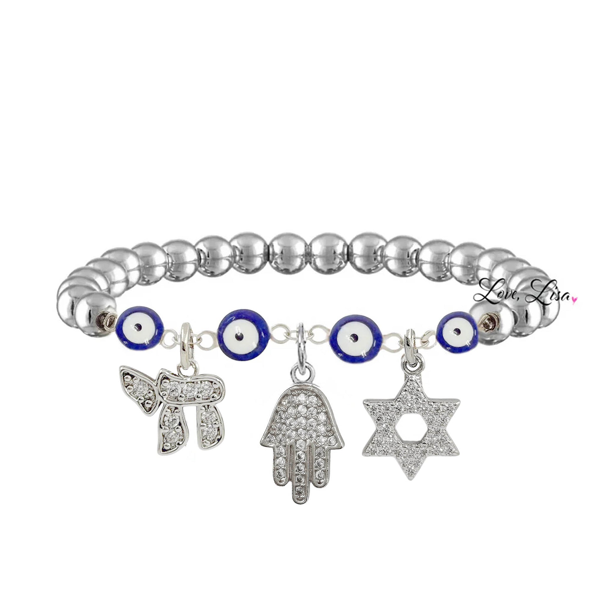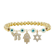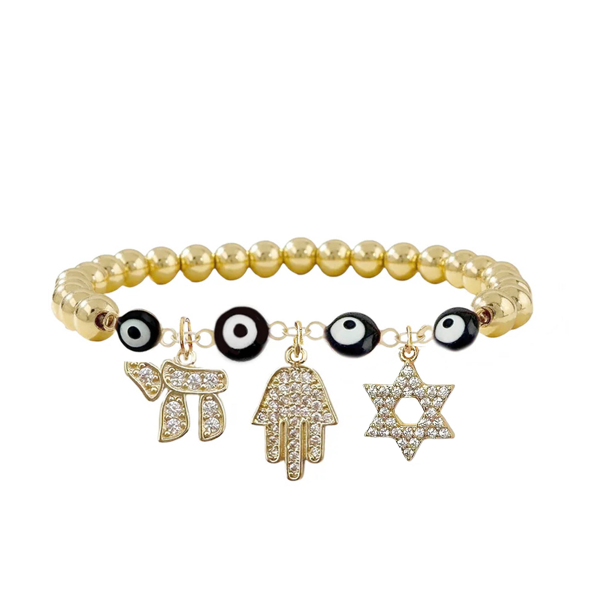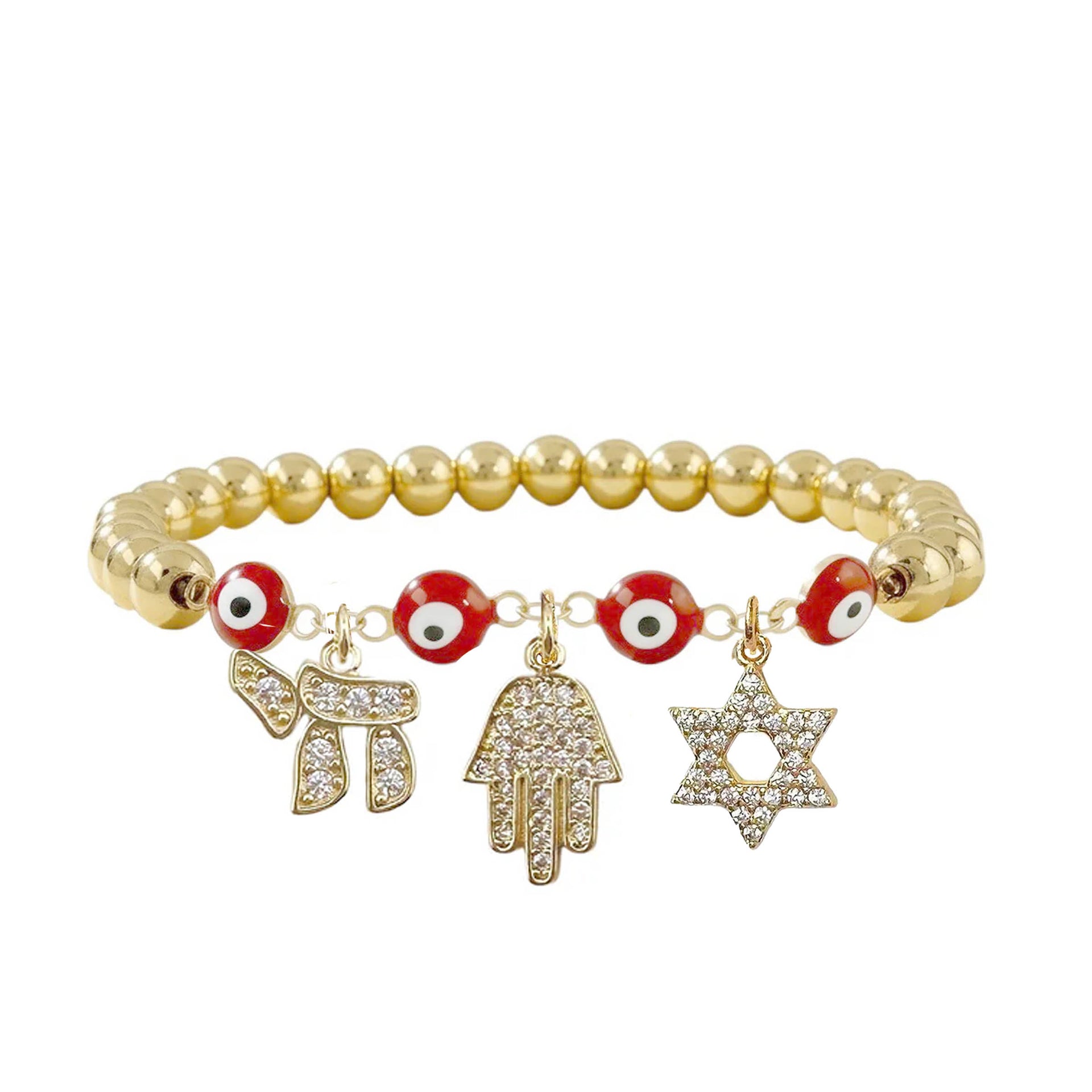Each detail carries significance. The evil eye is  known for protection against negativity, the Hamsa represents blessings and protection, the Star of David symbolizes faith and identity, and the Chai represents life. Together, they create a bracelet that feels deeply personal the moment it is put on.