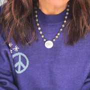 This one of a kind necklace features natural labradorite gemstones paired with a polished mother of pearl pendant set with a sparkling evil eye design. The subtle iridescence of labradorite catches the light with every movement, creating a calm, grounded energy while the evil eye charm brings a layer of protection and intention. Measuring 18 inches, this piece sits beautifully at the collarbone and layers effortlessly with your everyday chains. It is priced to sell and will not be restocked as Lisa only made 1 piece of this style.