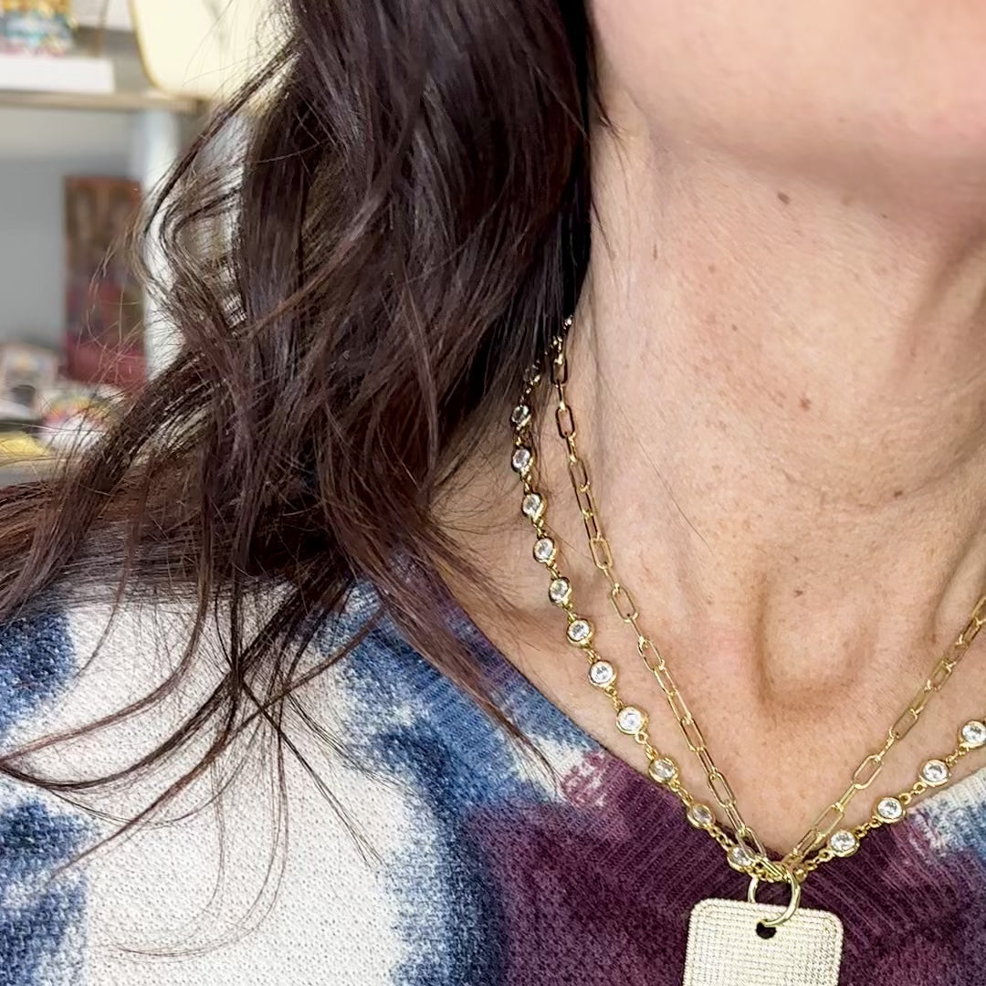 Make a bold statement with the Gabby Diamond Dog Tag Necklace, designed for those who love standout style. This striking piece features a 16-inch paperclip chain paired with a 17-inch diamond-by-the-yard chain, creating the perfect layered effect. At the center hangs an oversized dog tag pendant, encrusted with sparkling CZs for maximum shine. Whether styled with casual looks or dressed-up outfits, Gabby is the ultimate trendsetting necklace that’s sure to turn heads.