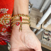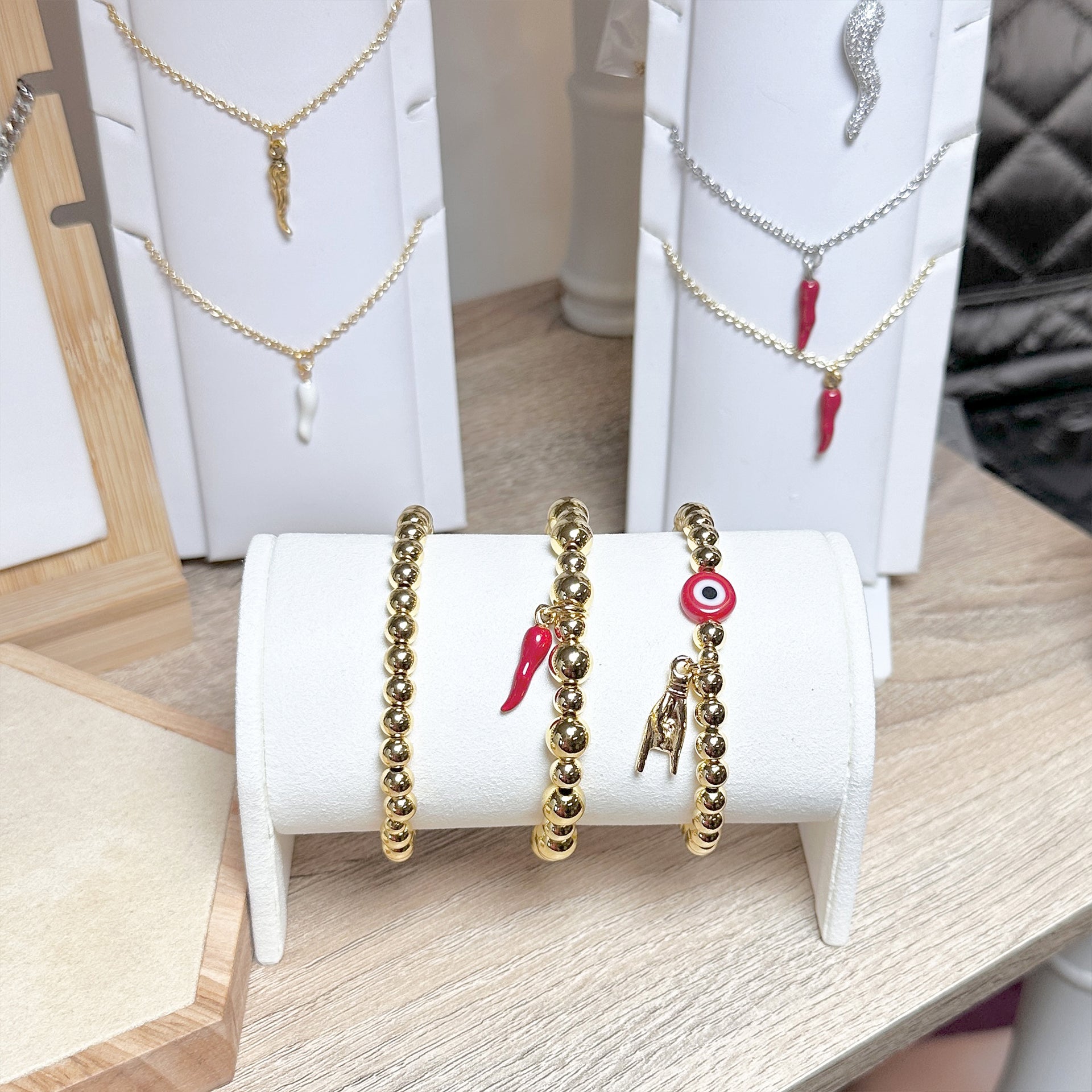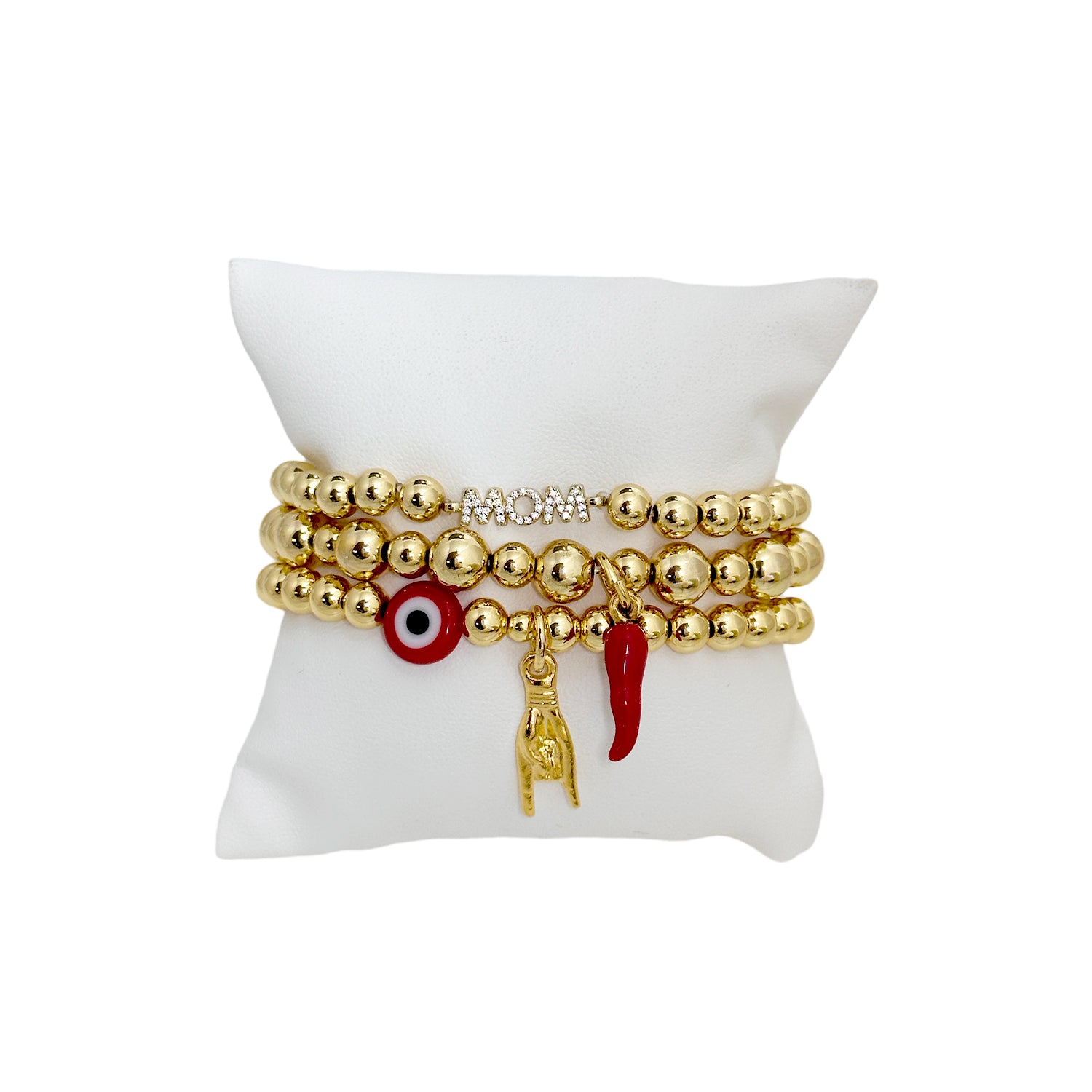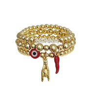 The Maria Italian Horn Bracelet Collection brings timeless Italian charm and symbolism to your everyday style. Crafted with 6mm beads and stretch fit, each 6.85-inch bracelet features meaningful elements like the iconic red Italian horn, the Mano Cornuto hand sign, and heartfelt message beads such as “Nonna” and “Mom.” The horn is known to ward off negativity, while the Mano Cornuto brings protection and luck. Wear them solo or stack them together—each bracelet carries powerful heritage with a modern twist.