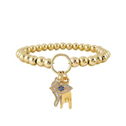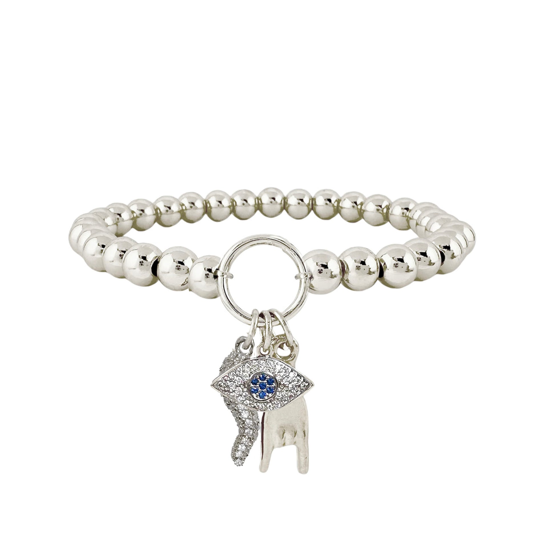 Smooth 6mm brass beads which are dipped in rhodium create a fuller look while remaining lightweight and comfortable. Three meaningful charms hang from a center ring: a red Italian horn for luck and protection, a sparkling evil eye believed to guard against negativity, and a mano charm symbolizing strength and guidance. Each charm moves freely, giving the bracelet natural motion and personal significance.