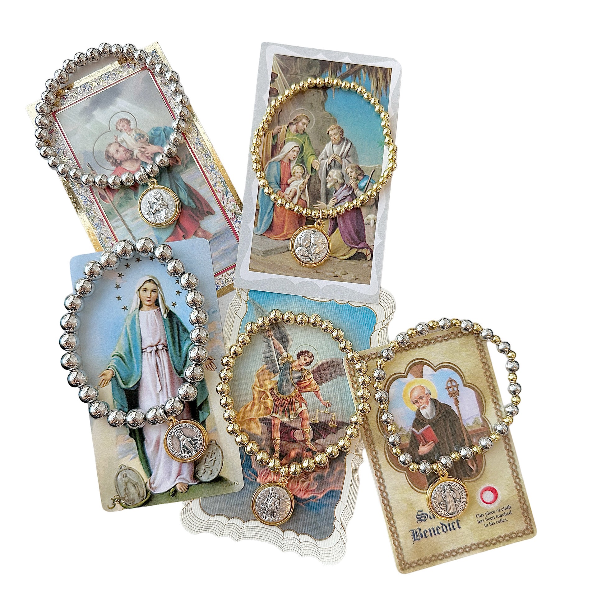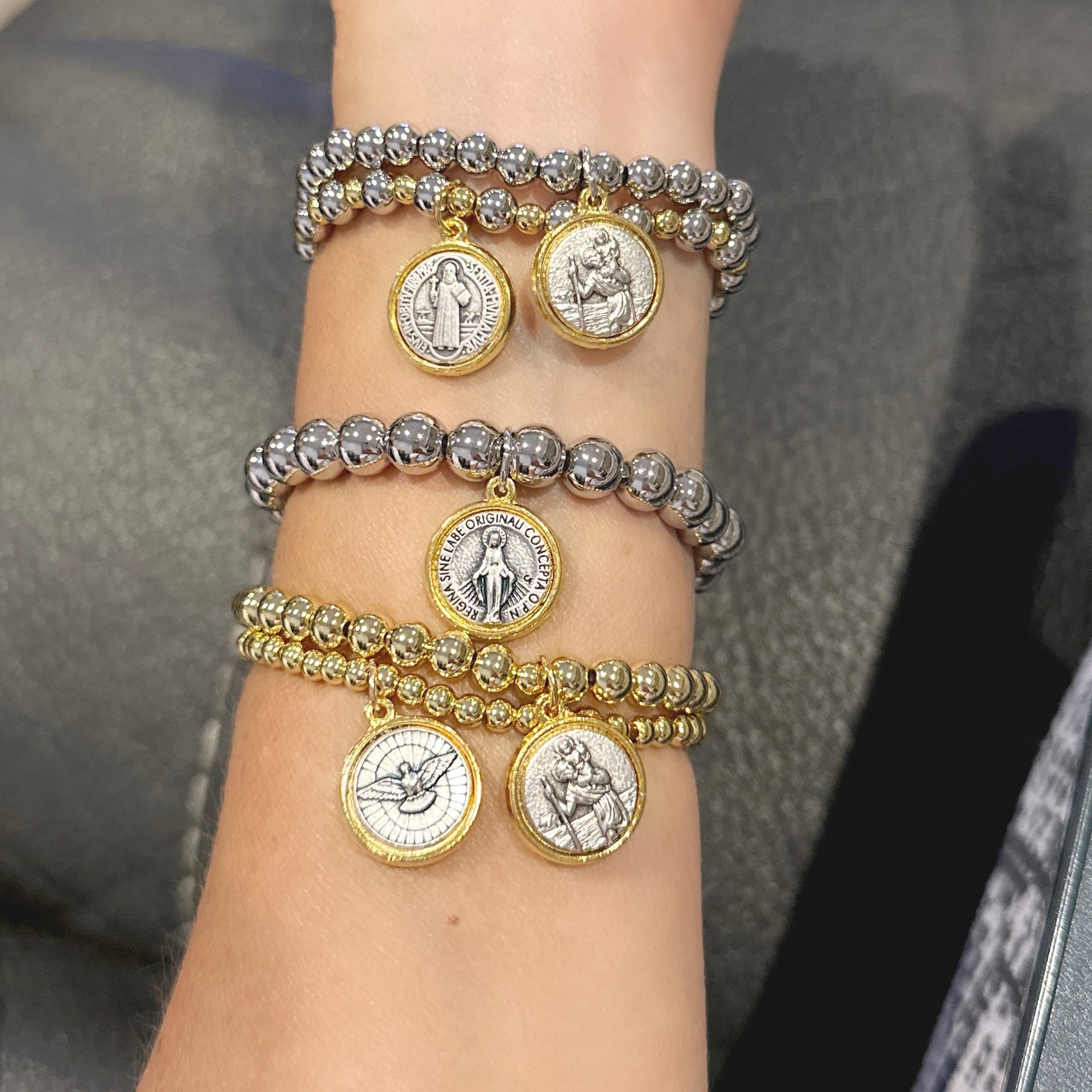 The Mary Stack of 5 Religious Prayer Bracelets is your go to way to stay faithful and stylish at the same time. This statement stack features five stretch bracelets with polished silver beads and two tone Catholic medal charms including St Michael, the Holy Spirit, the Miraculous Medal, St Christopher and St Benedict. Each charm was chosen to surround you with protection, guidance and a little divine fashion inspiration. Wear all five together for a bold layered look or mix and match them with your favorite Love Lisa bracelets to create a stack that feels personal, meaningful and completely you.