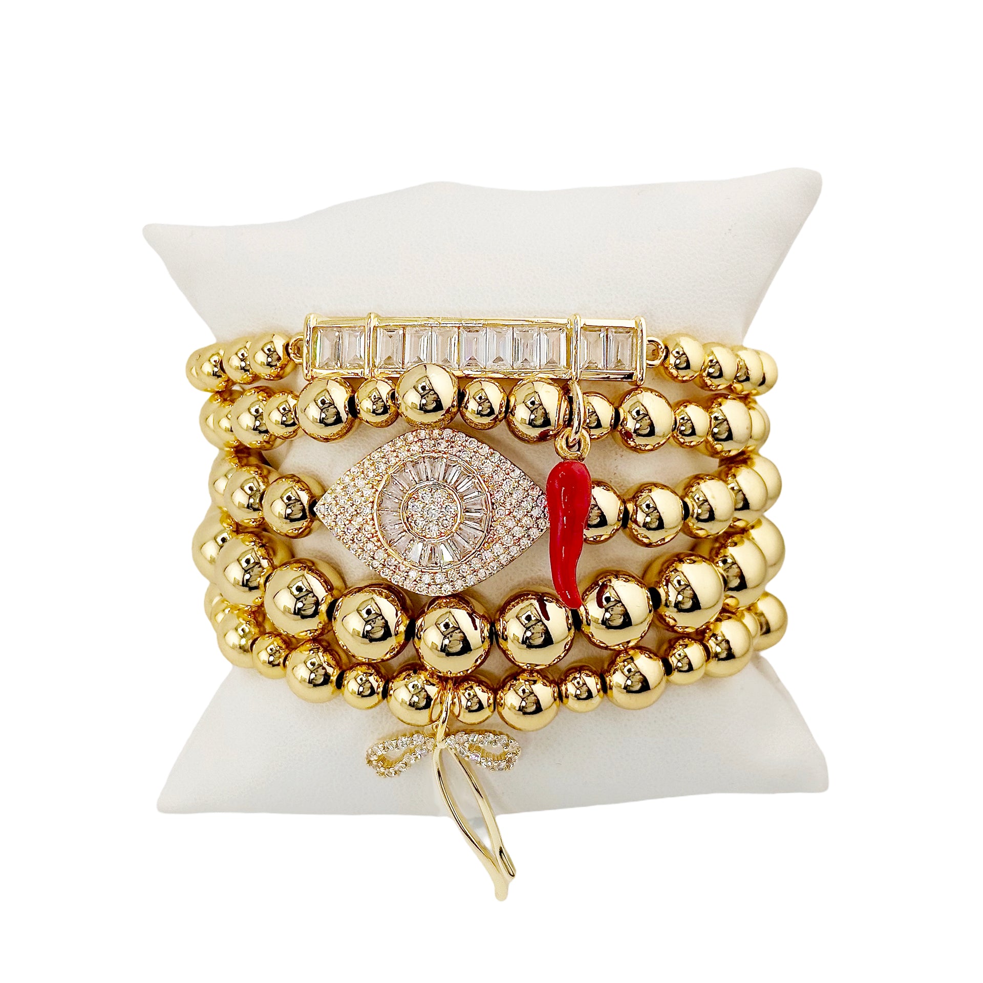 Explore our incredible selection of trendy bracelets inspired by the Mob Wives aesthetic! Featuring an Italian horn charm, an evil eye charm, and a stunning baguette bar, these bracelets are sure to add serious flair to your arm. The "mob wife aesthetic" incorporates luxurious fur coats, sleek leather, bold animal prints, and glamorous gold jewelry, popularized by the cult TV series The Sopranos in 1999. Don't miss out on this must-have look.