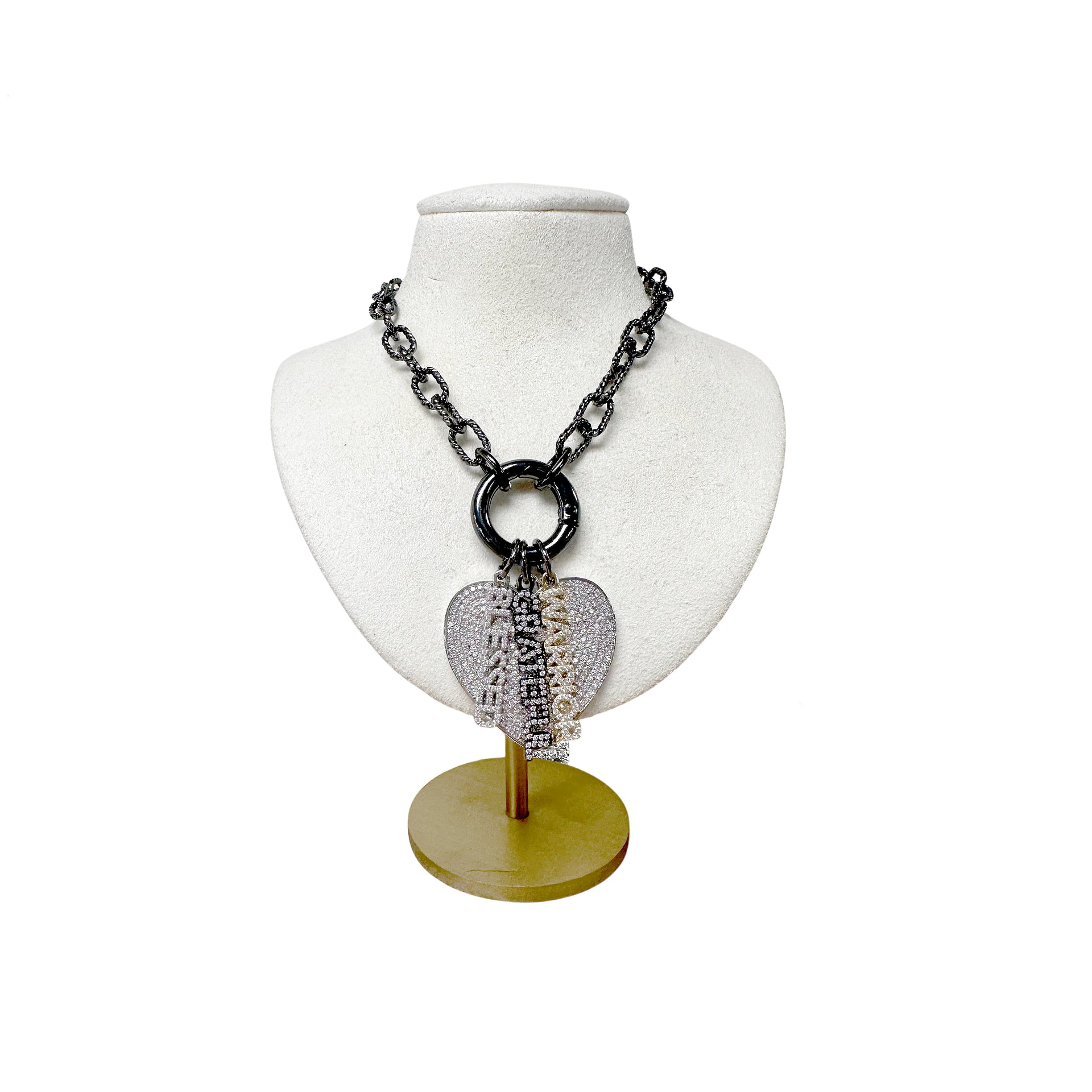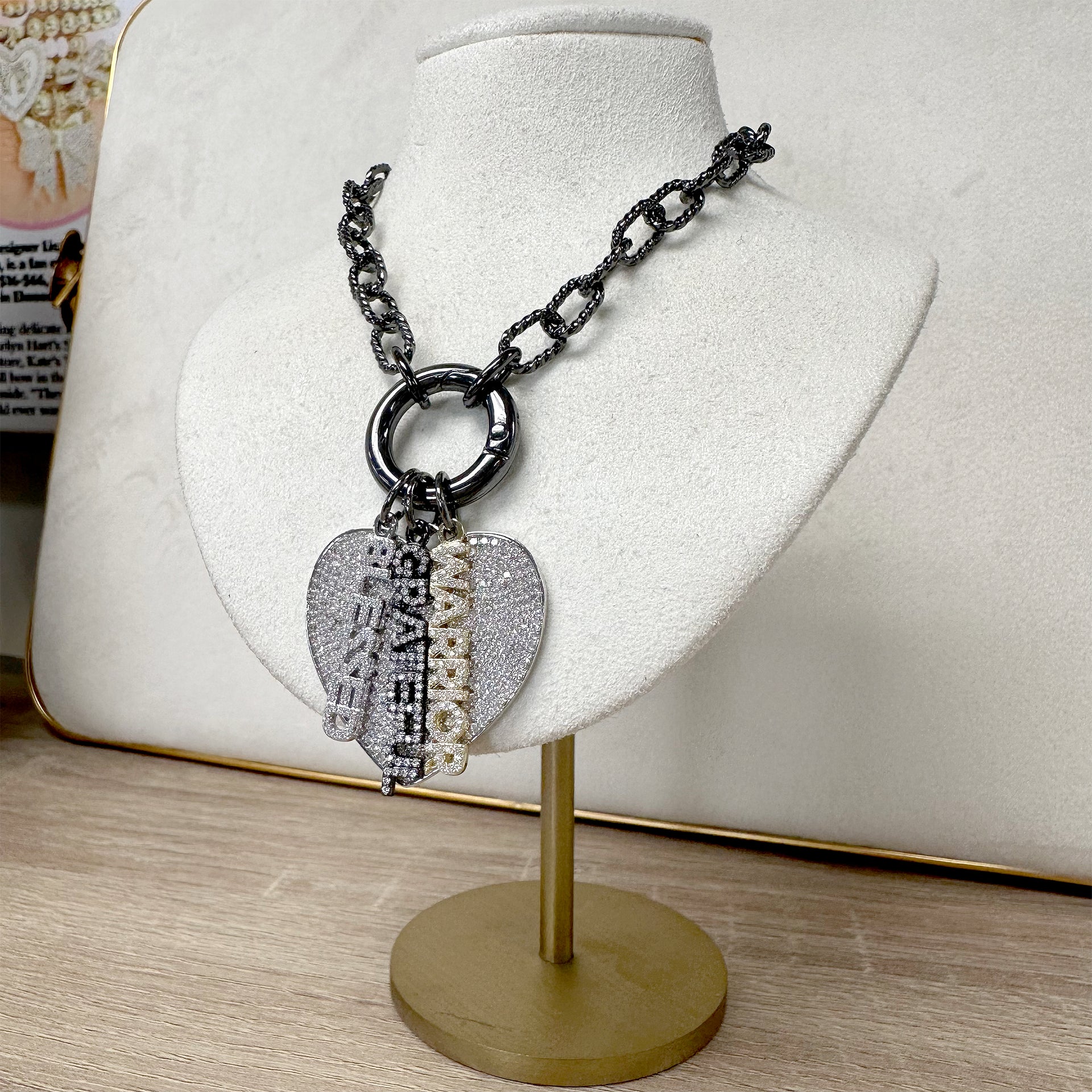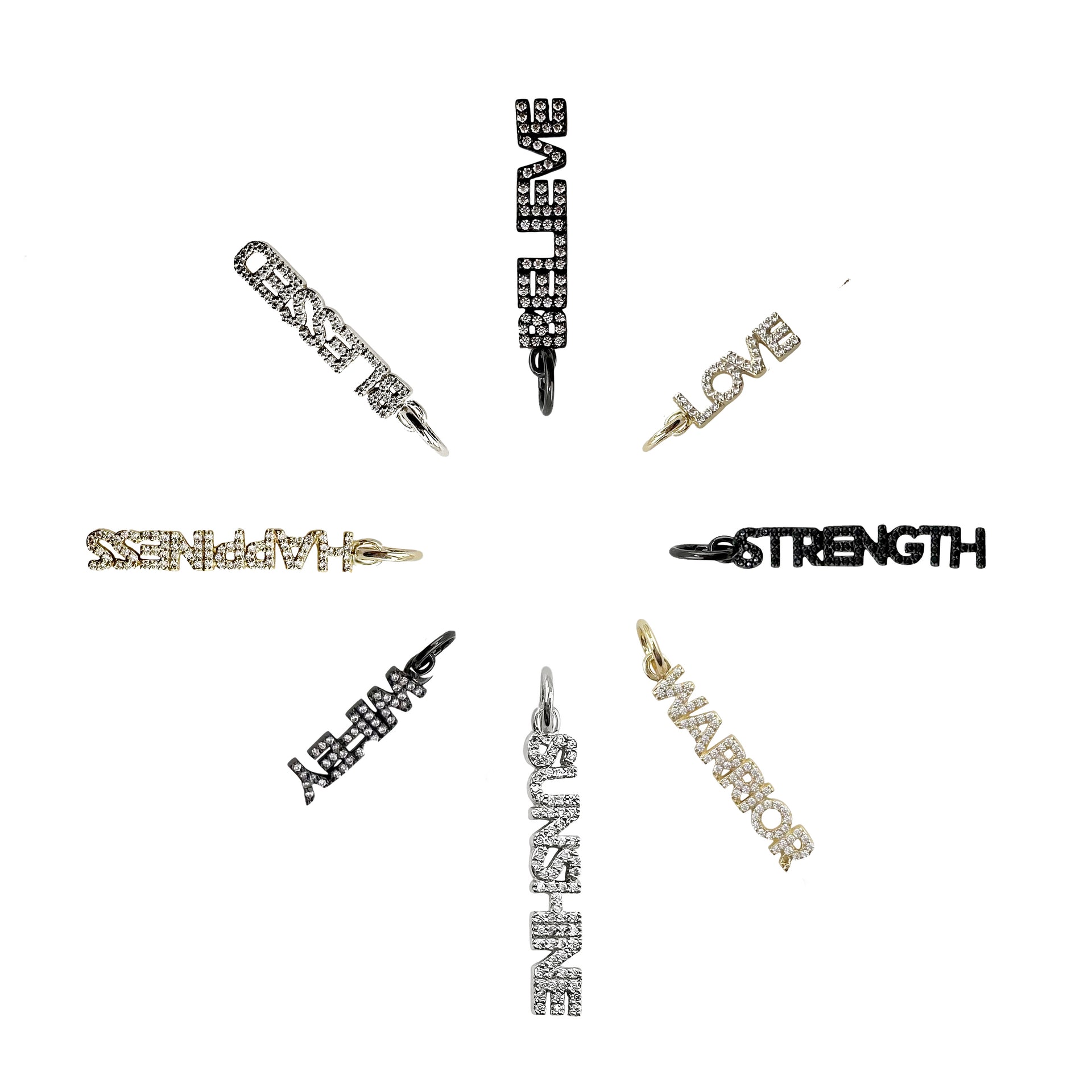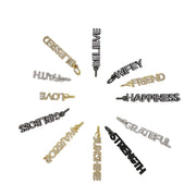 Let your personality shine with our stunning Shimmering Word Charms, a collection of elegant, crystal-encrusted charms that celebrate the words that matter most. Each charm sparkles with pavé crystals, radiating positivity and inspiration. Choose from meaningful words like Strength, Love, Faith, and more, available in gold, silver, and black finishes to suit your unique style. Perfect for necklaces, bracelets, or bag accessories, these charms are more than just jewelry—they’re an expression of who you are.