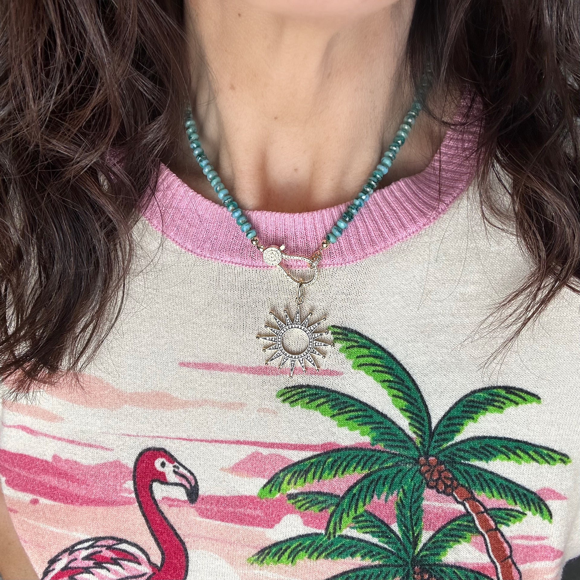 Turn heads with the bold brilliance of the Solar Sunburst Charm — a radiant, open-centered sunburst that adds instant fire to your jewelry collection. With its spiked silhouette and pavé details, this charm delivers statement energy in three striking finishes: classic Gold, edgy Gold & Black Diamond, and modern Gold/Gunmetal. Designed to fit effortlessly onto any Love, Lisa clasp necklace or bracelet, it’s perfect worn alone or stacked with your favorite charms. Handcrafted in Massapequa, NY, the Solara Sunburst Charm is your golden hour — all day long.