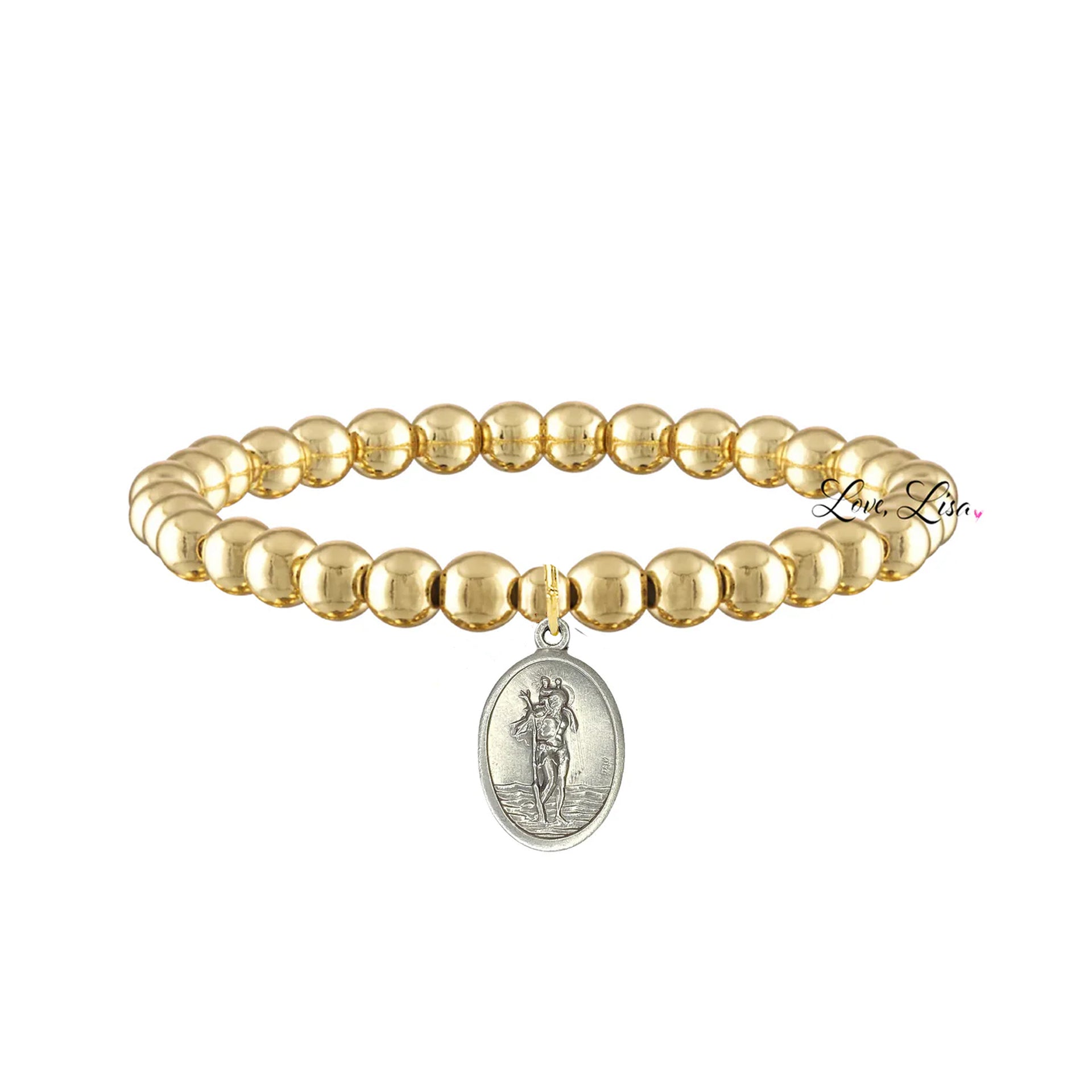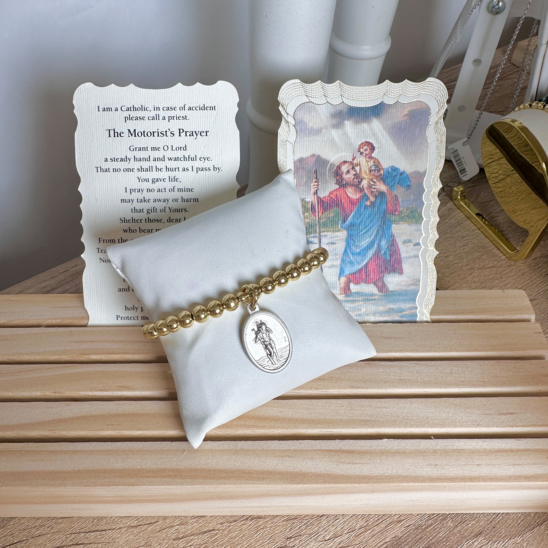 Support and protect new drivers with the Saint Christopher New Driver Bracelet. Featuring polished 6mm silver or gold beads and a silver-tone St. Christopher medal—the patron saint of travelers—this stretch bracelet offers comfort and spiritual reassurance. Measuring 6.85", it slips on easily and comes with a printed Motorist’s Prayer card, making it a perfect gift for graduations, first cars, or road trips.