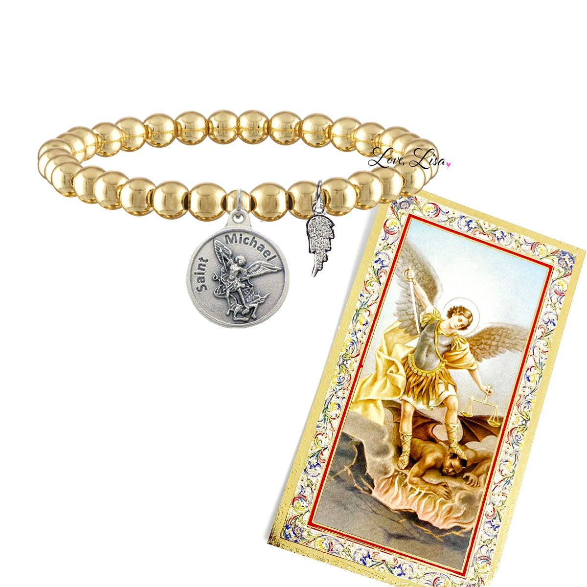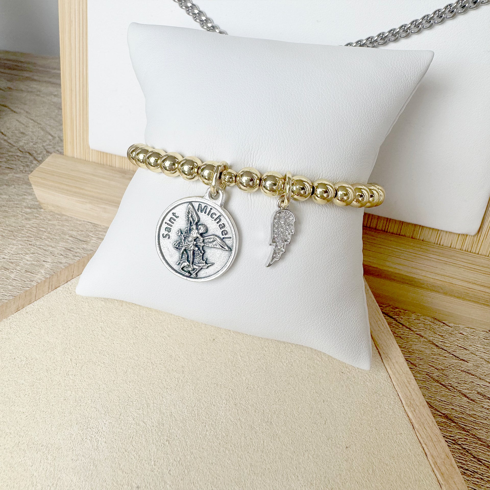 The Tami St. Michael Bracelet is a powerful tribute to strength, faith, and protection. Designed with 6.85" stretch beads, it features a two-sided medallion—St. Michael the Archangel on one side and a police badge on the other—plus a delicate angel wing charm. Whether worn in honor of a loved one in law enforcement or for spiritual comfort, this meaningful bracelet reminds you that your angel is always near.