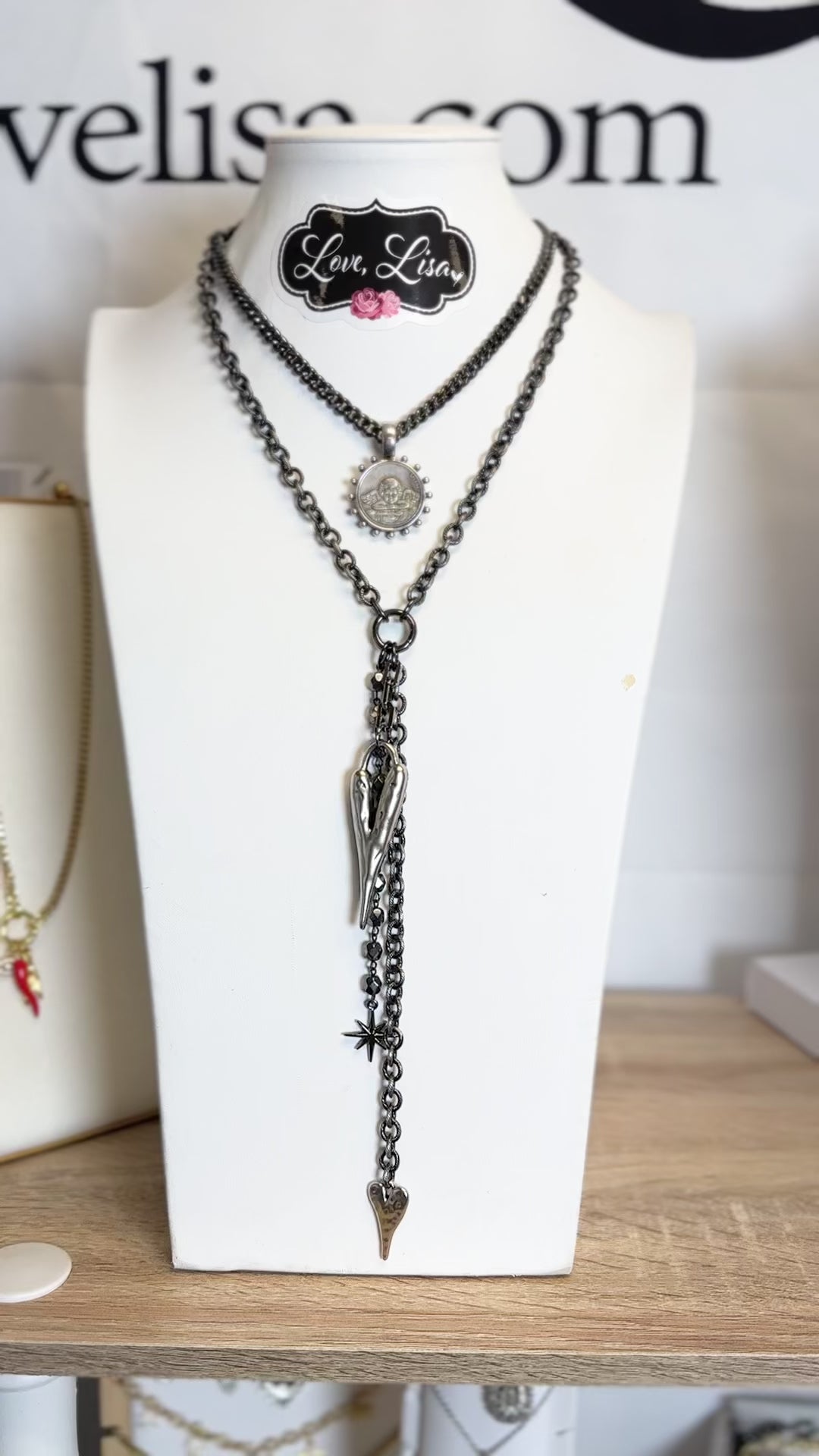 Now available in two fierce lengths — the original 18" or a bold 28" that you can wear long or double wrap thanks to the magnetic clasp. The Vixen Heart Drop Necklace isn’t playing nice. Designed with an antique gunmetal chain, this piece drips with edge and confidence. The elongated, hammered heart pendant brings serious attitude, flanked by black faceted beads, a gleaming starburst, and a sculpted mini heart.